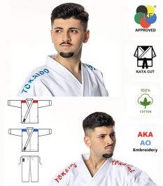 Conjunto de karategui Tokaido Kata Master Duo WKF (12 oz. etiqueta Plata – Premier League). Pack compuesto por un pantalón y dos chaquetas: una con bordado azul y otra con bordado rojo, para permitir un cambio rápido según las normas de competición. Un karategui de alta gama, diseñado para ofrecer máxima precisión, comodidad y libertad de movimiento tanto en entrenamientos como en campeonatos oficiales. Homologado por WKF / RFEK. Ideal para competidores y practicantes de kata que buscan una marca japonesa de prestigio, con la fiabilidad TOKAIDO y un precio más accesible que otras opciones premium del mercado. El uso de karategis WKF Approved con el bordado de la marca en los hombros, en rojo y azul, es obligatorio en todos los eventos oficiales de la WKF (World Championships, Premier League, Series A y Youth League).